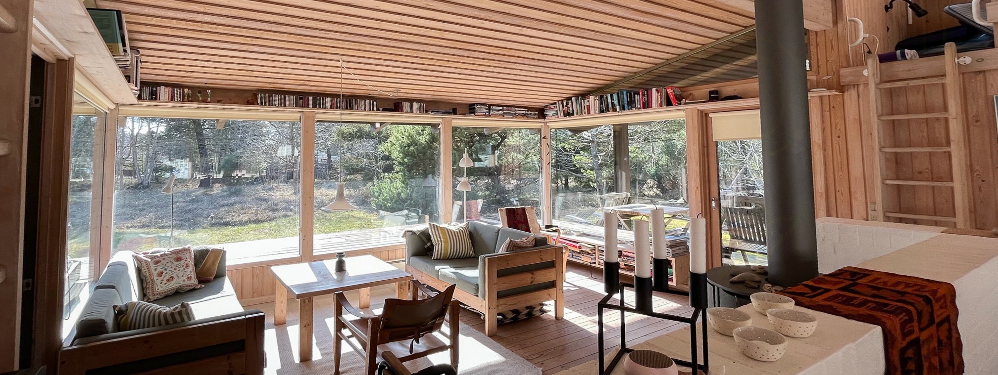 Sommerhusets absolutte hjerte er det åbne køkken- og opholdsrum, der er fyldt af gennemtænkte kvalitetsløsninger og finurlige detaljer, I kan gå på opdagelse i. De store vinduesflader i karnappen trækker lyset og naturen helt ind. Her kan I slænge jer i de gedigne møbler i solidt træ og naturmaterialer, måske med en bog fra de indbyggede reoler under loftet og en god kop kaffe indenfor rækkevidde - eller blot med udsigten til naturens vilde teater og dyrelivet udenfor. Vinduerne under taget og den øgede loftshøjde over køkkenet giver en generøs rumfornemmelse, når I sidder bænket om plankebordet til måltider, hygge og snak. I begge ender af rummet er der stiger op til en eventylig hems, hvor børn og barnlige sjæle vil elske at krybe i ly, bygge hule og måske overnatte under taget.