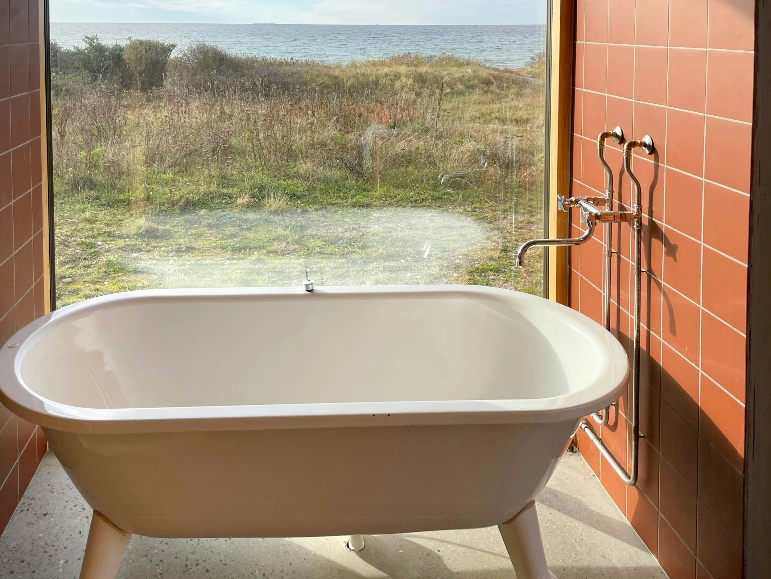- Slap af i badekarret med udsigt over vandet efter en dag ved kysten