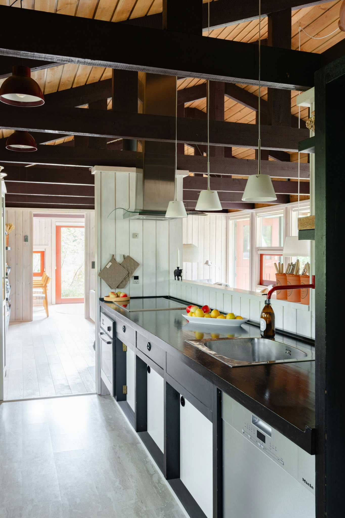 I huset er der højt til loftet med loft til kip, mens de mørke loftsbjælker giver rummene et smukt, arkitektonisk udtryk. De rødmalede vinduer og døre er samtidig med til at sætte et unikt præg på indretningen. Tilbered måltiderne i det åbne, veludstyrede køkken med de fine, retro detaljer, og nyd maden på den hyggelige bænk i spisehjørnet. Huset er gennemført og stilfuldt indrettet med kvalitet og klassisk, dansk design.