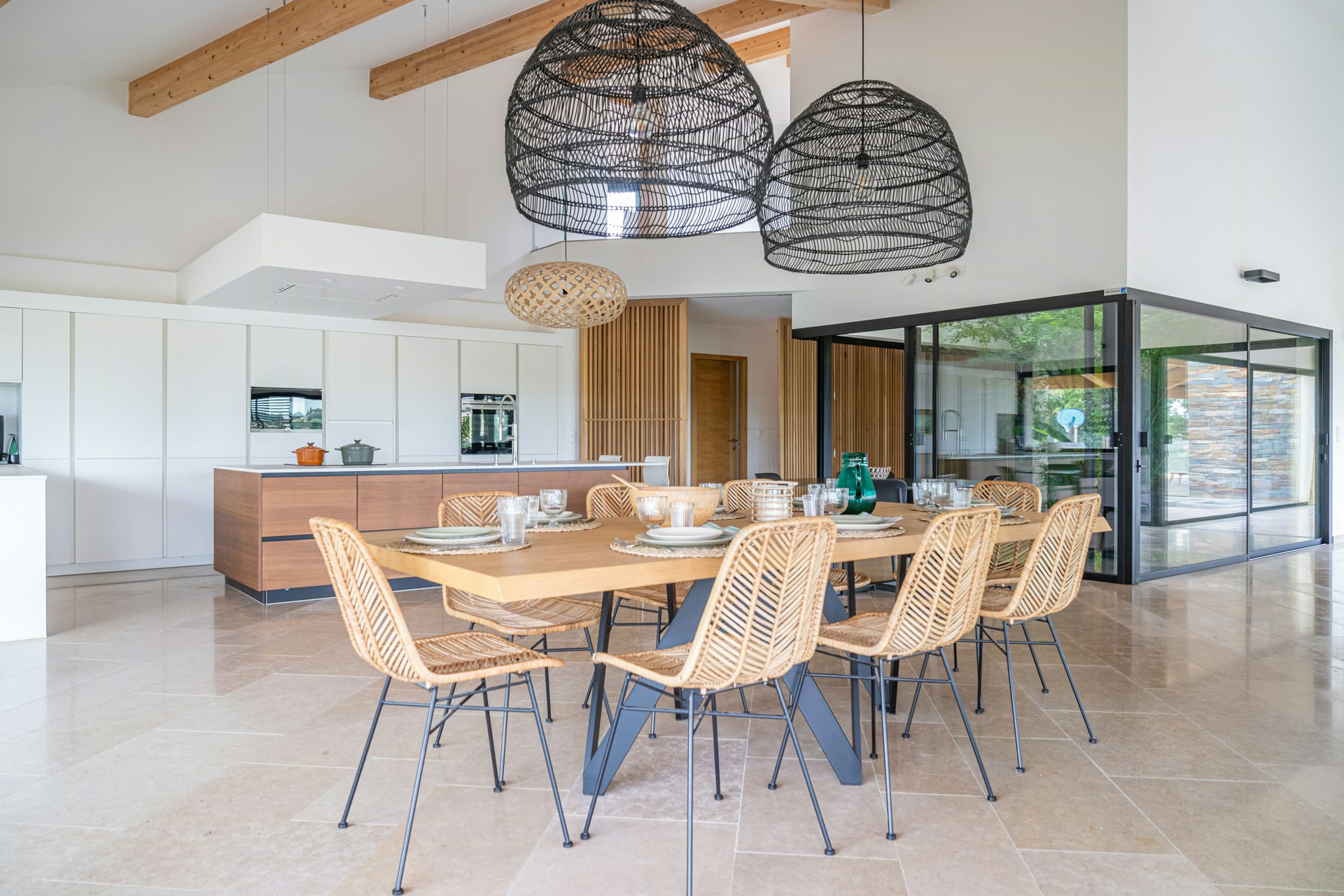 De store stuer åbner sig mod haven takket være de store vinduespartier. Spisestuen, det moderne køkken og stuen danner en sammenhængende helhed, badet i naturligt lys. De eksklusive møbler og ædle materialer skaber en raffineret og beroligende atmosfære, der kun afbrydes af det blide sus fra det indre vandfald.