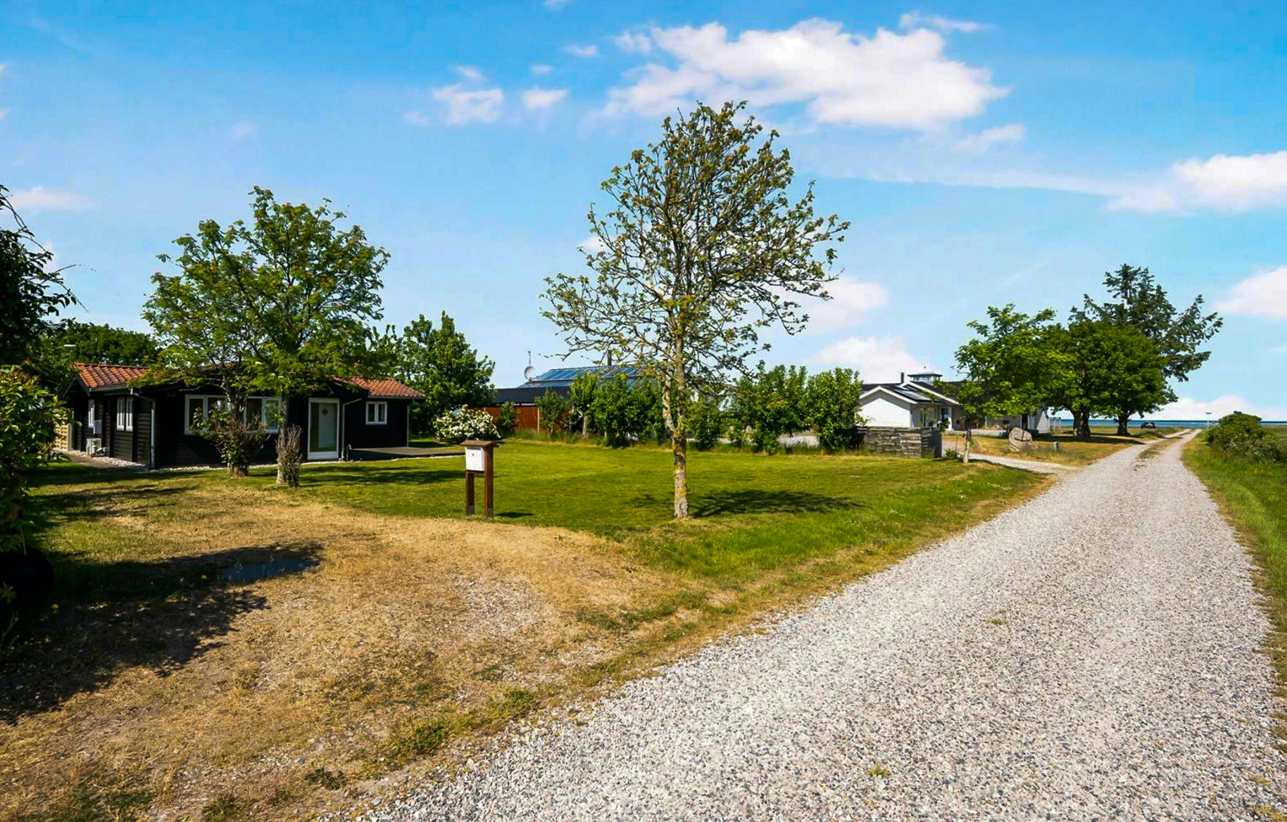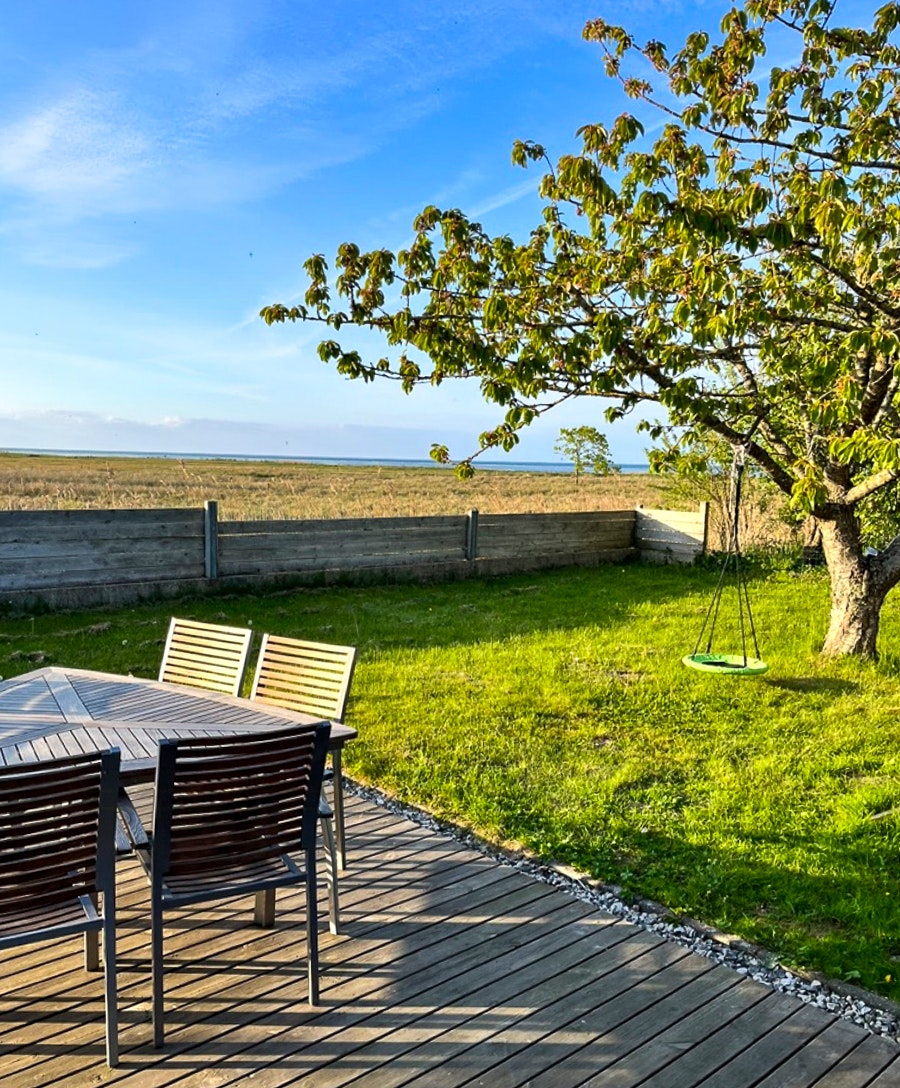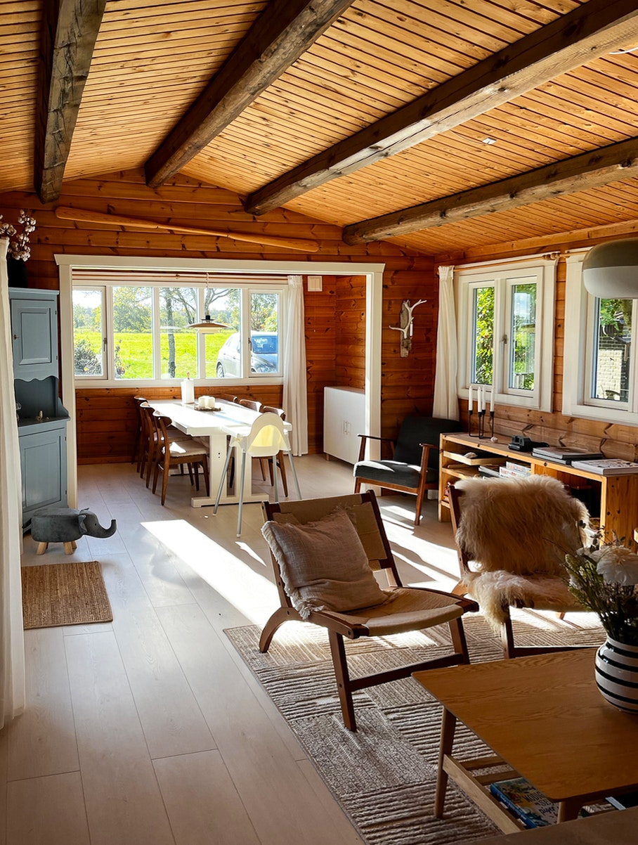 Bjælkehus med vandudsigt nær Fjellerup strand