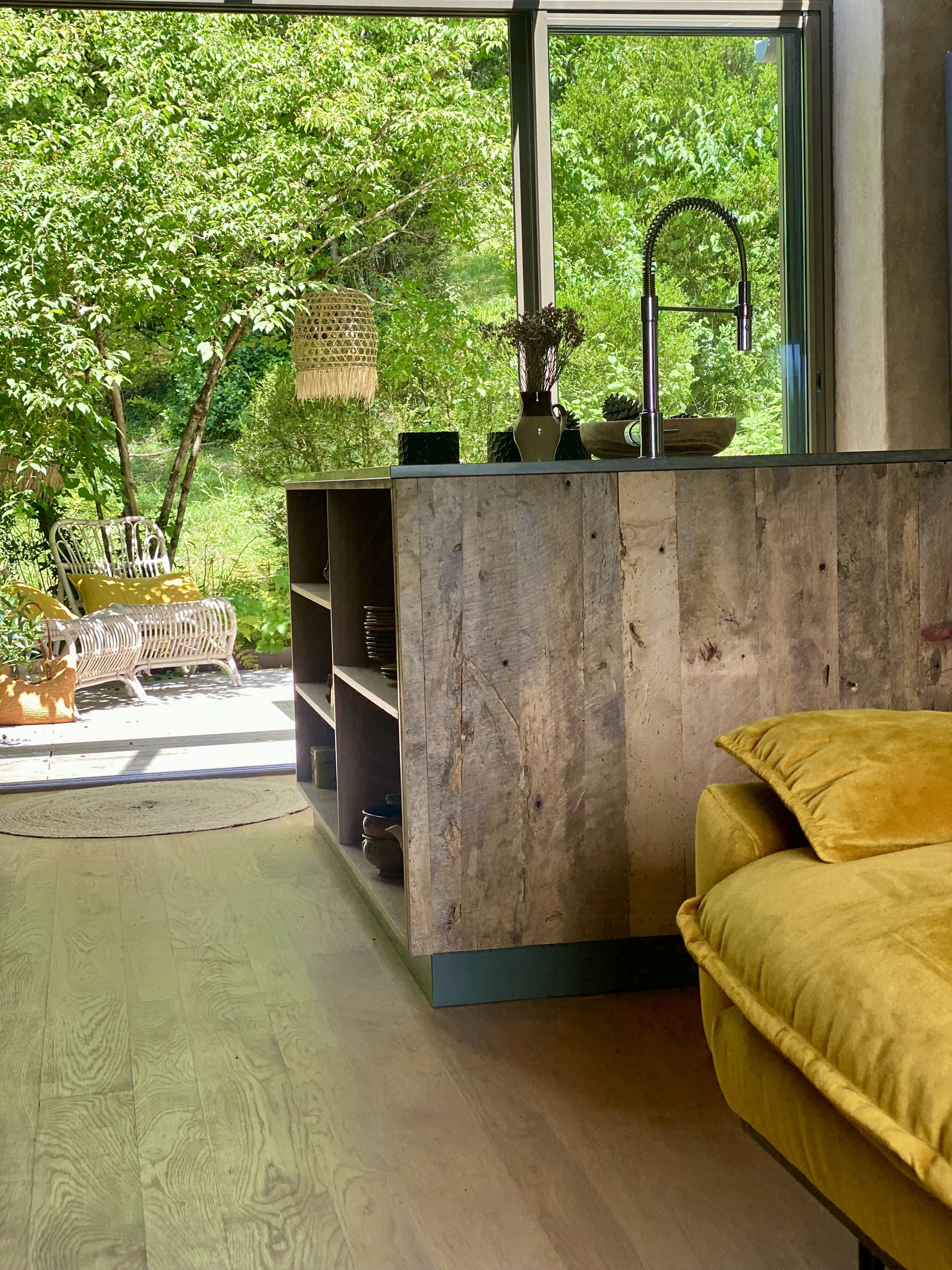 - Nyd udsigten til en majestætisk fyrretræ i det uendelige gennem det store glasparti i denne gamle lade bygget af naturmaterialer