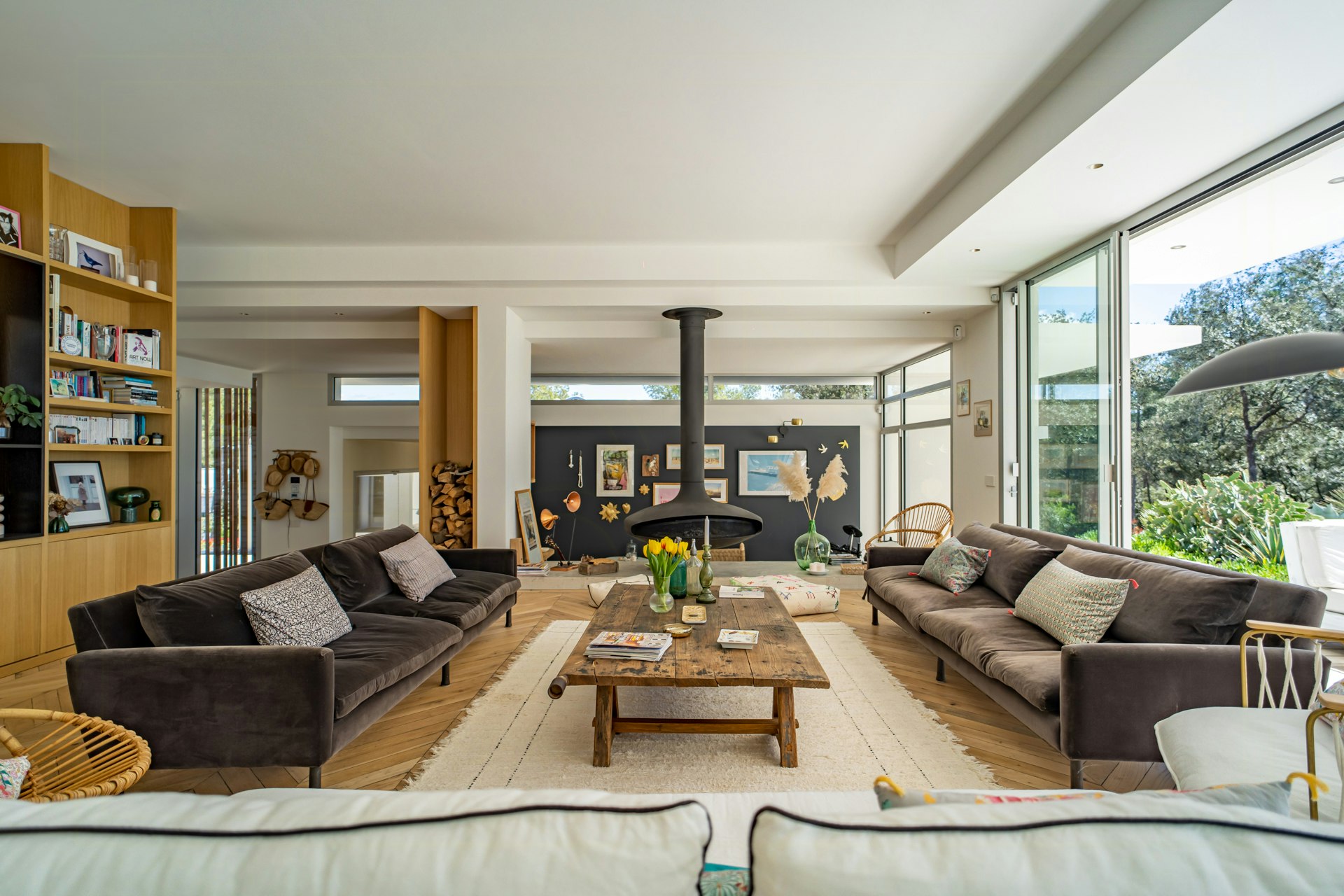 Die großen Fensterfronten durchfluten die Räume mit Tageslicht und schaffen einen ständigen Dialog mit der Landschaft. Die Einrichtung ist eine Mischung aus Vintage-Stücken und modernem Design, ergänzt durch einen hängenden Focus-Kamin. Vier Doppelzimmer mit Fußbodenheizung bieten Platz für bis zu 8 Personen.