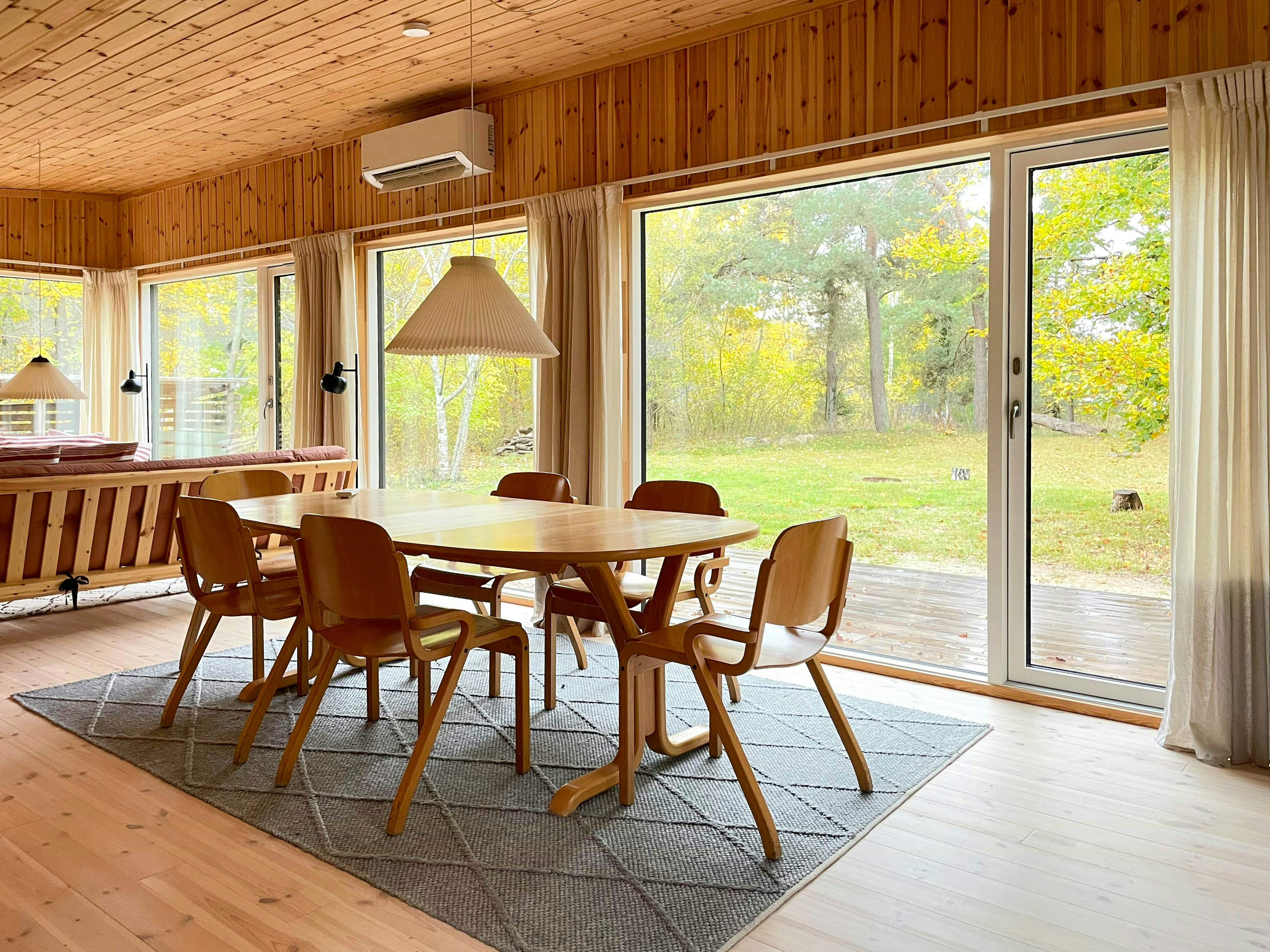 Erleben Sie nostalgische Ferienhausatmosphäre mit Kiefernholzwänden und klassischen Möbeln aus den 60er Jahren.