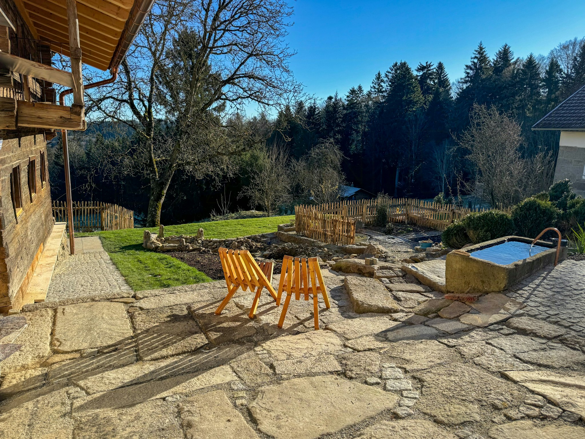 Der 5 Hektar große Naturgarten bietet zahlreiche Rückzugsorte zum Entspannen. Zwischen alten Obstbäumen, naturbelassenen Steinmauern und einem plätschernden Bach können Ihr die heimische Tierwelt wie Feuersalamander beobachten.