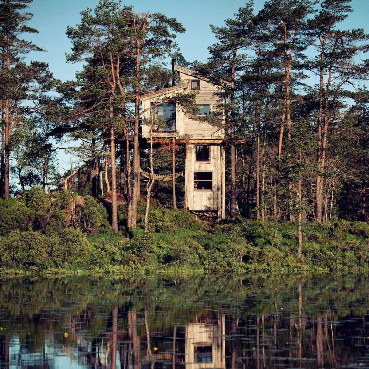 - Erkunden Sie eine mehrstöckige Baumkronenhütte an einem Waldsee