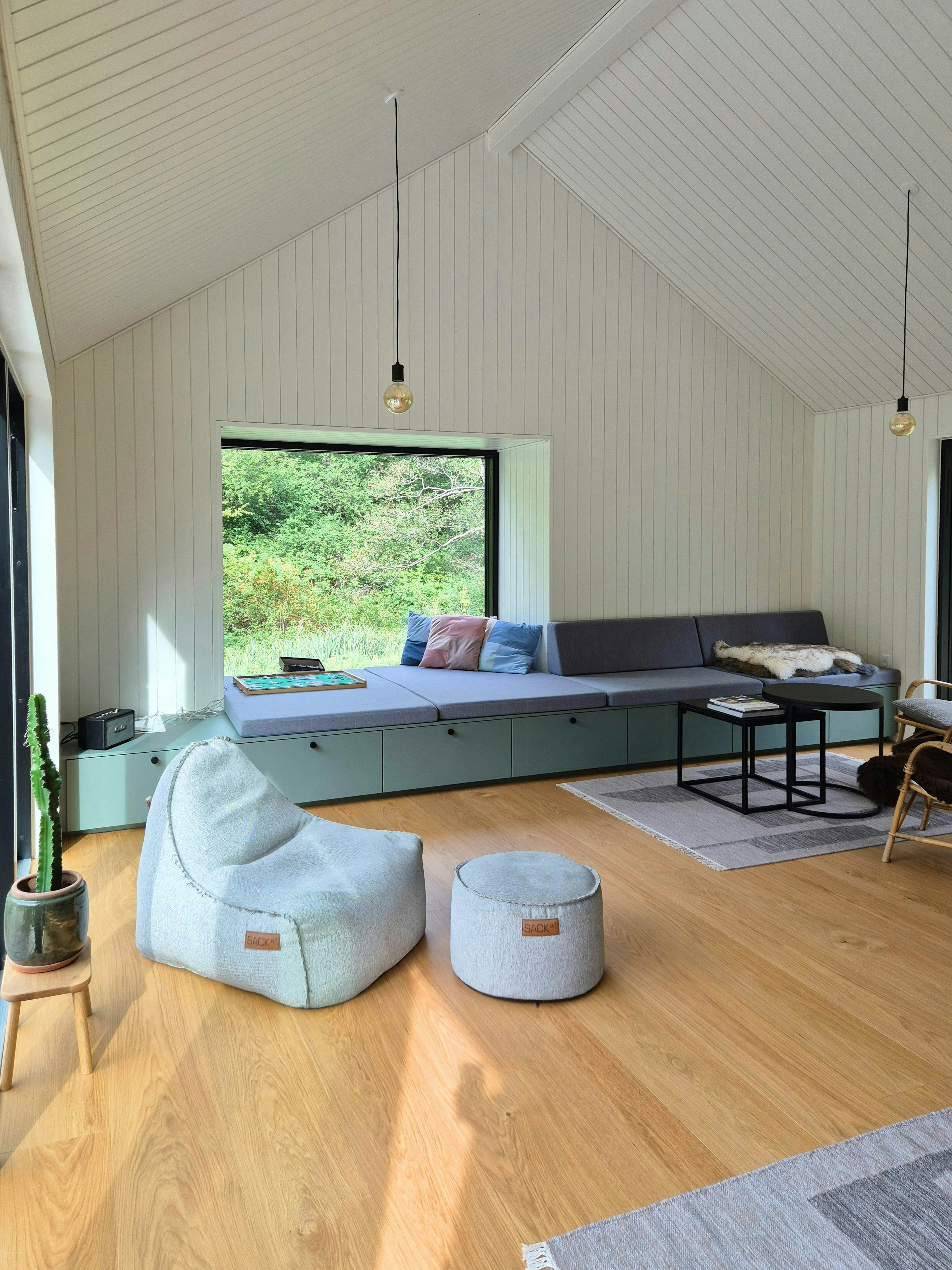 Der große Gemeinschaftsraum öffnet sich zum Dach hin und schafft ein fantastisches Raumgefühl. Das eingebaute Sofa hat eine Nische, in der Sie lesen, puzzeln oder einfach nur den Blick auf den Wald genießen können. Das Sofa kann als zwei zusätzliche Schlafplätze genutzt werden. Die beiden Schlafzimmer haben Schränke unter den Betten, und der Dachboden ist eine schöne Höhle mit rundem Fenster und Blick nach Osten.