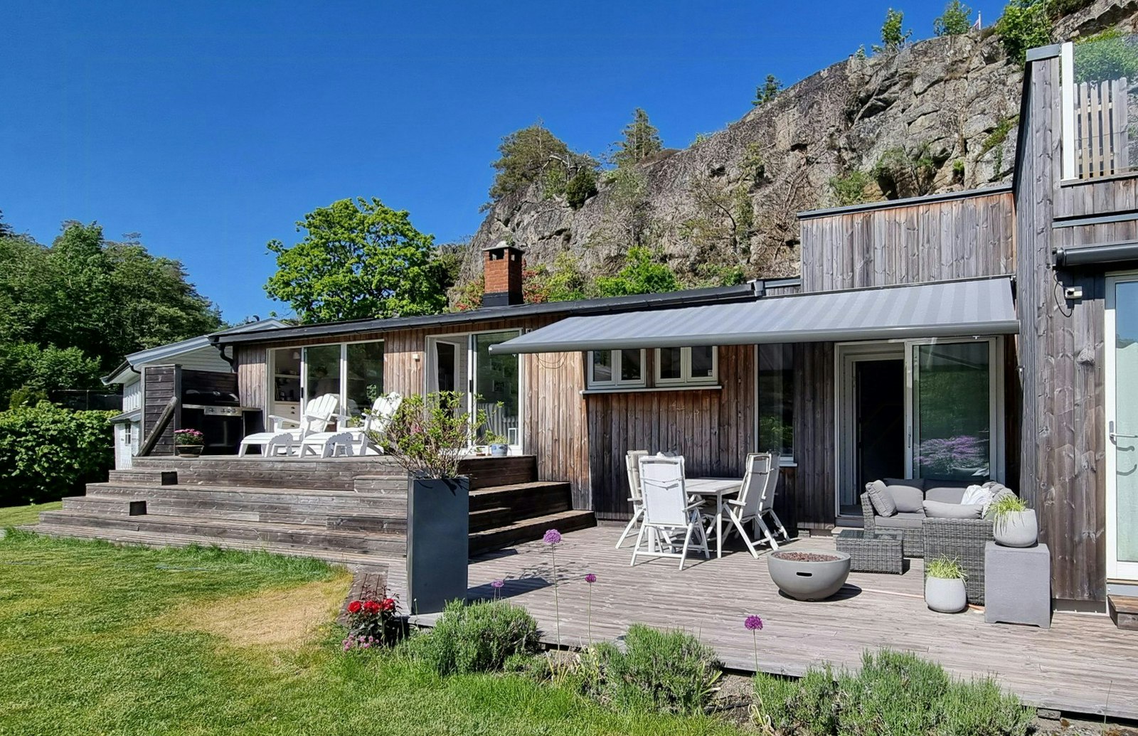The thoughtful layout offers large windows and patio doors in all common rooms, letting in both light and sea views. The kitchen is the social heart of the cabin, with a smart solution where the outdoor grill is an extension of the kitchen worktop. A cozy fireplace in the kitchen creates the right atmosphere on cooler evenings.