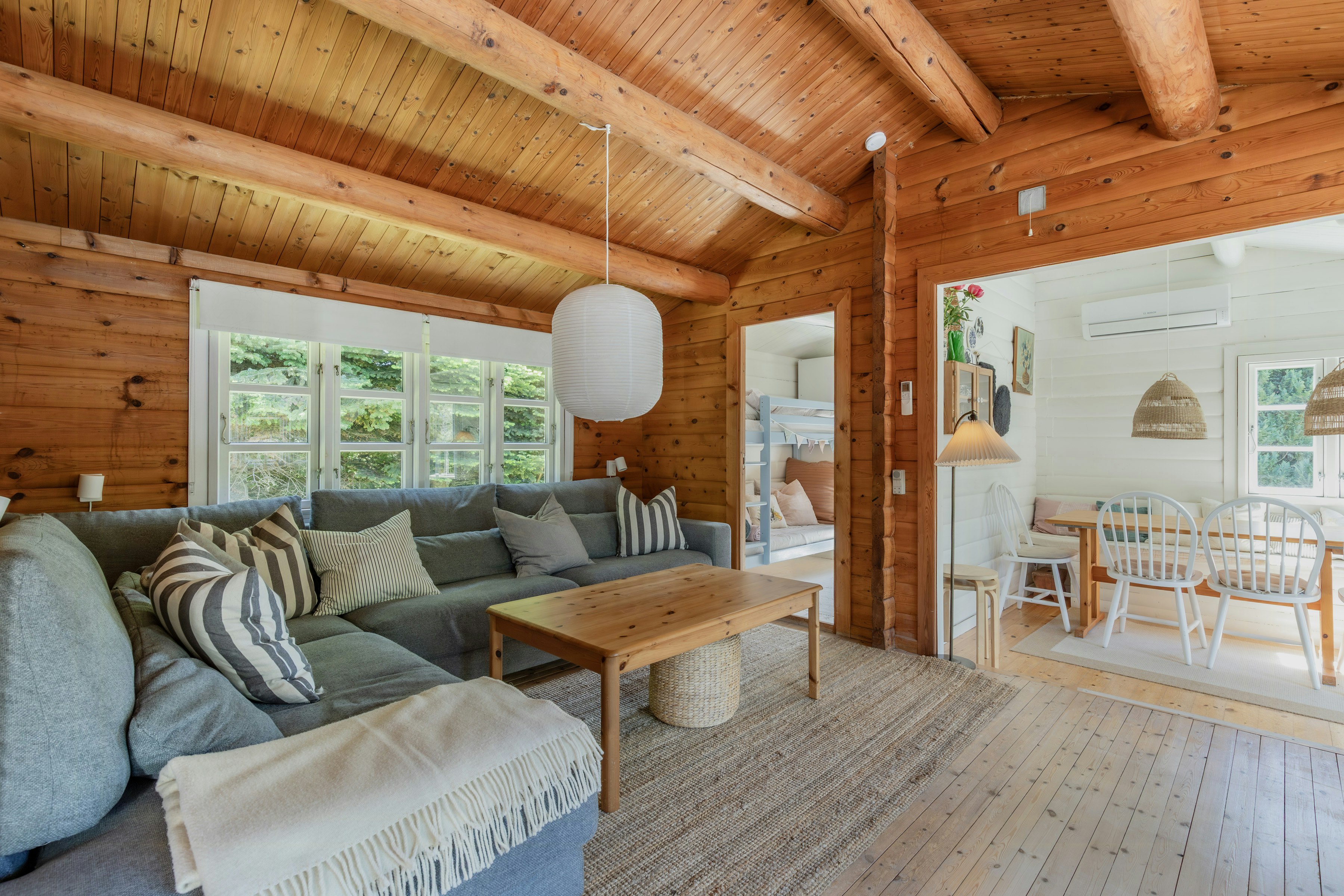 Discover the charm of a genuine log house with mullioned windows that ooze atmosphere and coziness. Enjoy warm summer days and cozy winter evenings by the wood-burning stove that casts a golden glow on the rustic logs of the house.