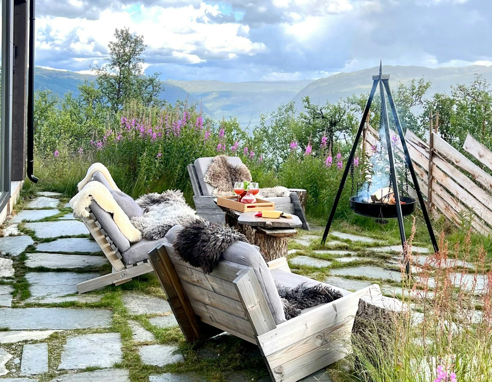 Outside, you can enjoy the fresh mountain air around a home-made fire pit and outdoor furniture. A practical outdoor shed, built with recycled materials, provides space for both firewood and ski equipment.