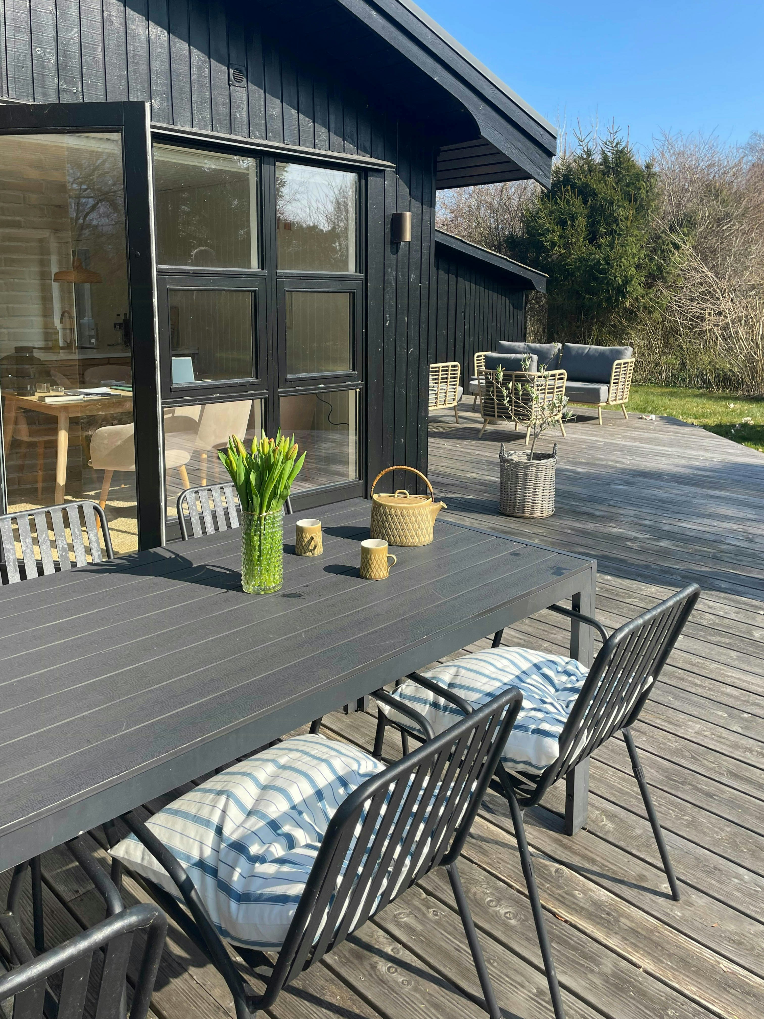 The garden is a peaceful haven with old trees full of character, creating natural spaces and shelter. The spacious wooden terrace that surrounds the house serves as an additional open-air living area - perfect for both breakfast in the sun and quiet evenings under the stars.
