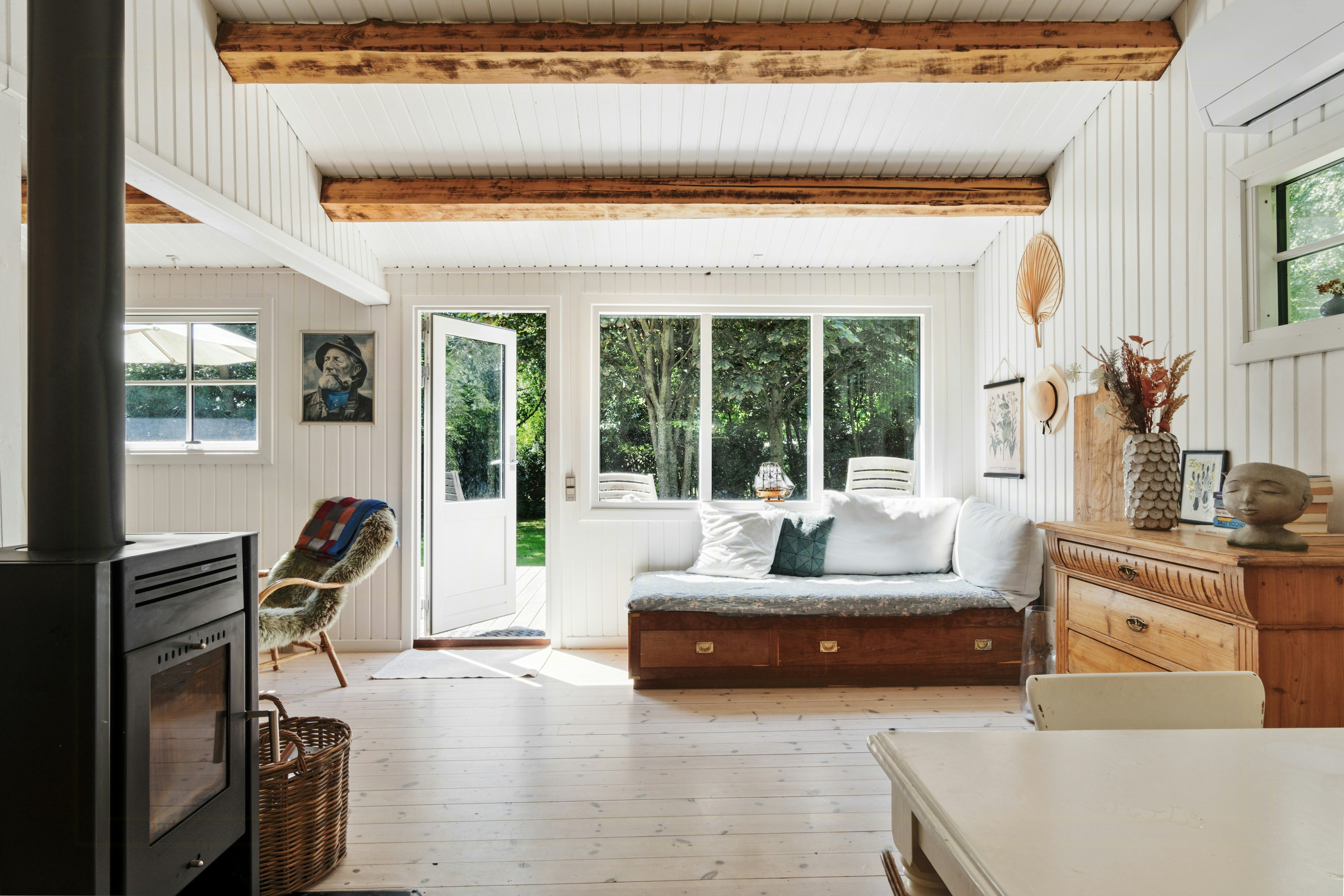 This tastefully renovated wooden house offers an authentic summer house experience, where light dances through the trees and creates a very special atmosphere. Here you will find a place that exudes authenticity and tranquility.