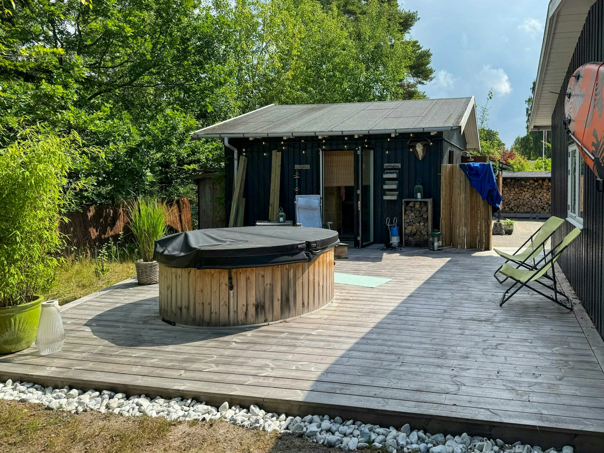- Relax by the fire pit or in the outdoor bath in the garden