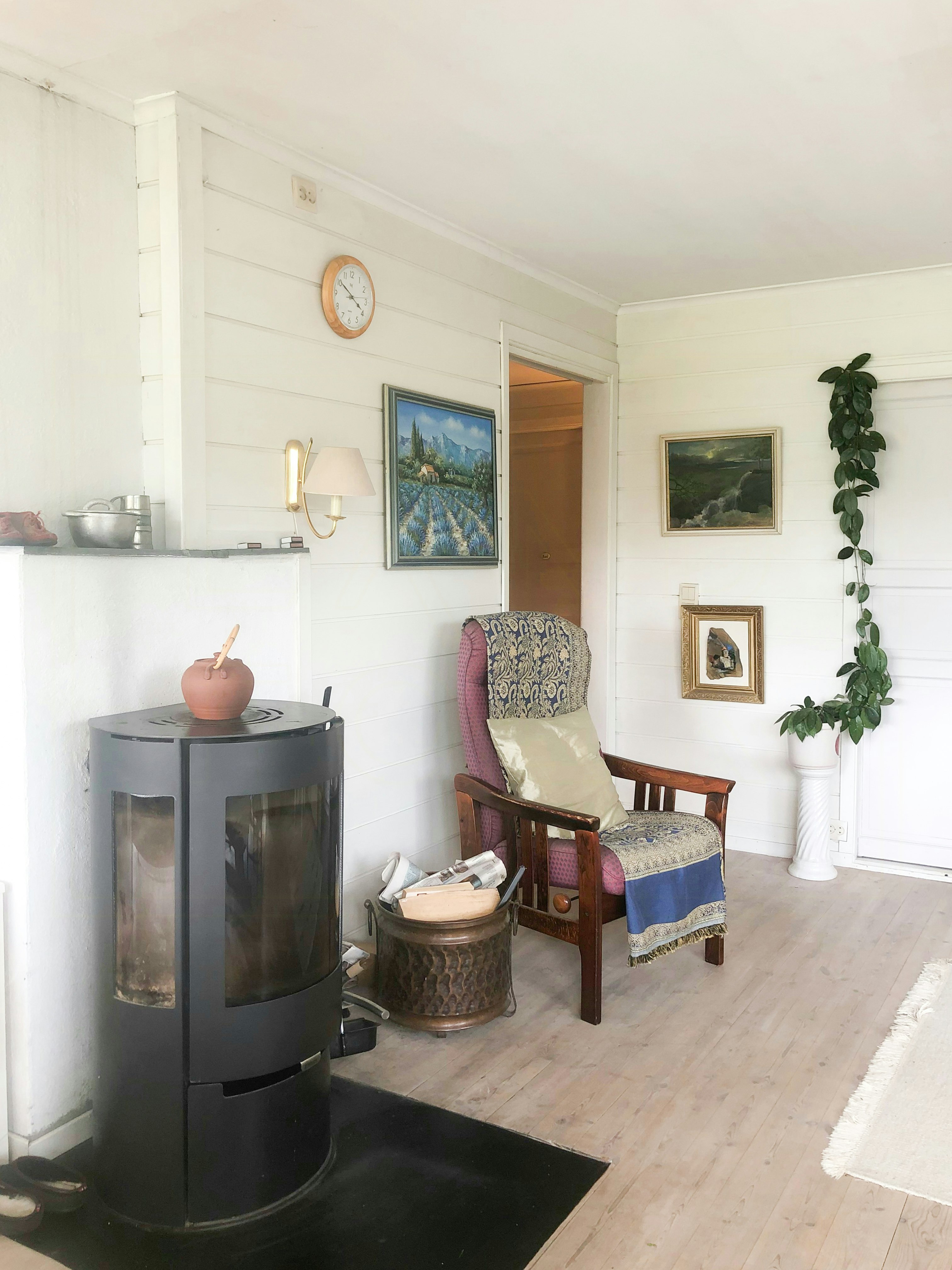 The interior is made of wood, with wood paneling on the walls and solid wood floors that provide a relaxed atmosphere. The living room has verandas on both sides, one facing east for morning coffee and the other west for the evening sun. Large floor-to-ceiling windows let in plenty of light and provide a fantastic view.