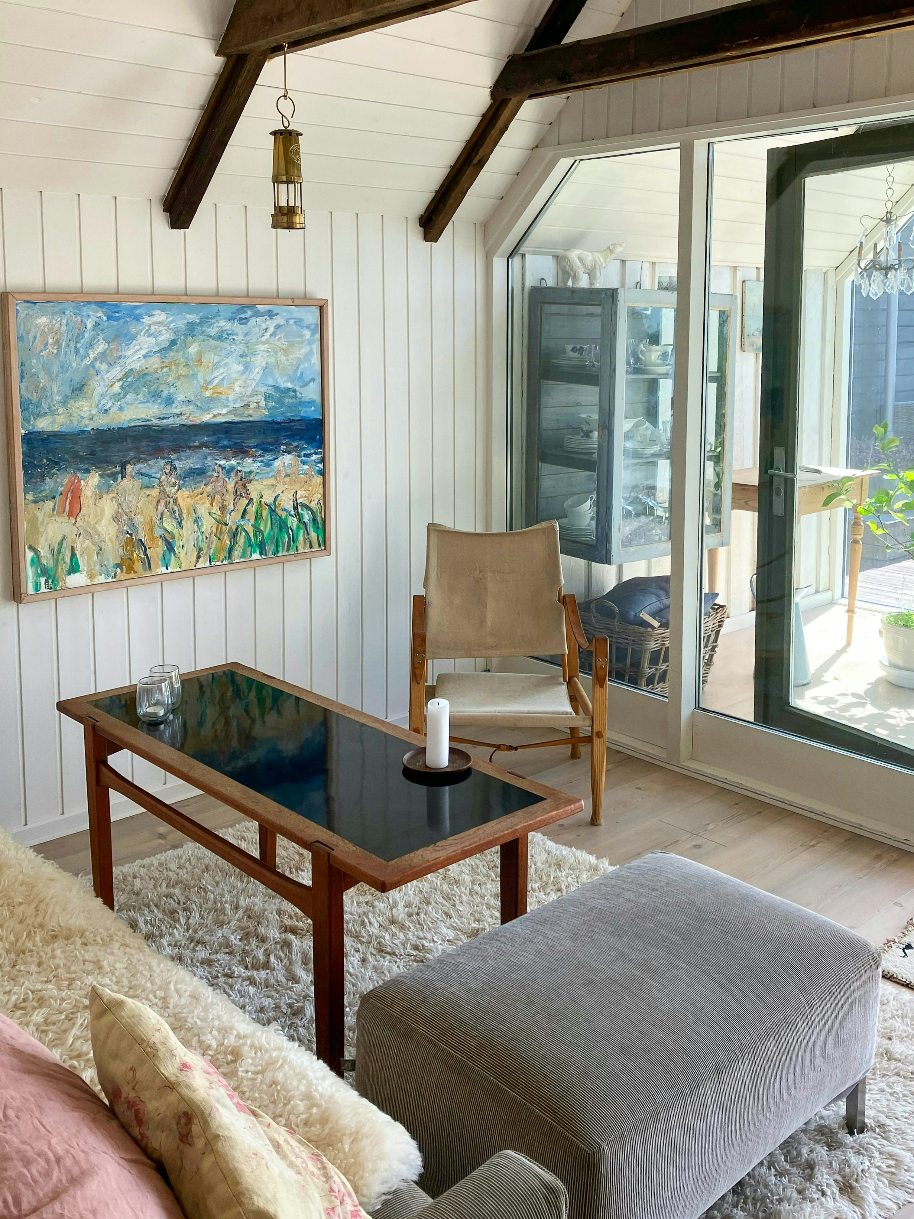 The cottage offers bright rooms with large windows that invite nature inside. The living room and annex have direct views of the water, and the different rooms create a natural flow between indoor and outdoor spaces.