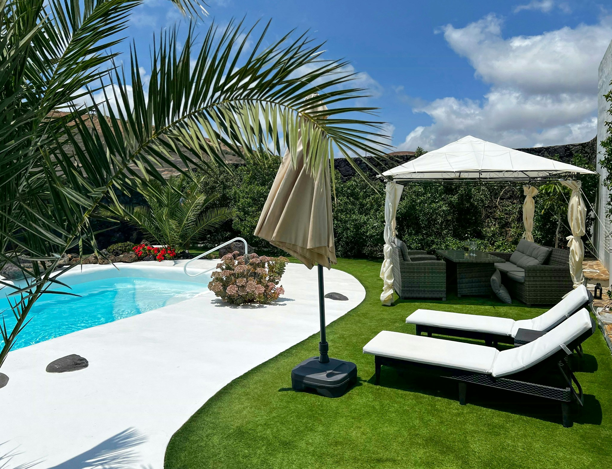 - Fate un tuffo nella piscina privata riscaldata dal sole, circondata da gelsomini, e godetevi il patio con l'albero di flamboyant