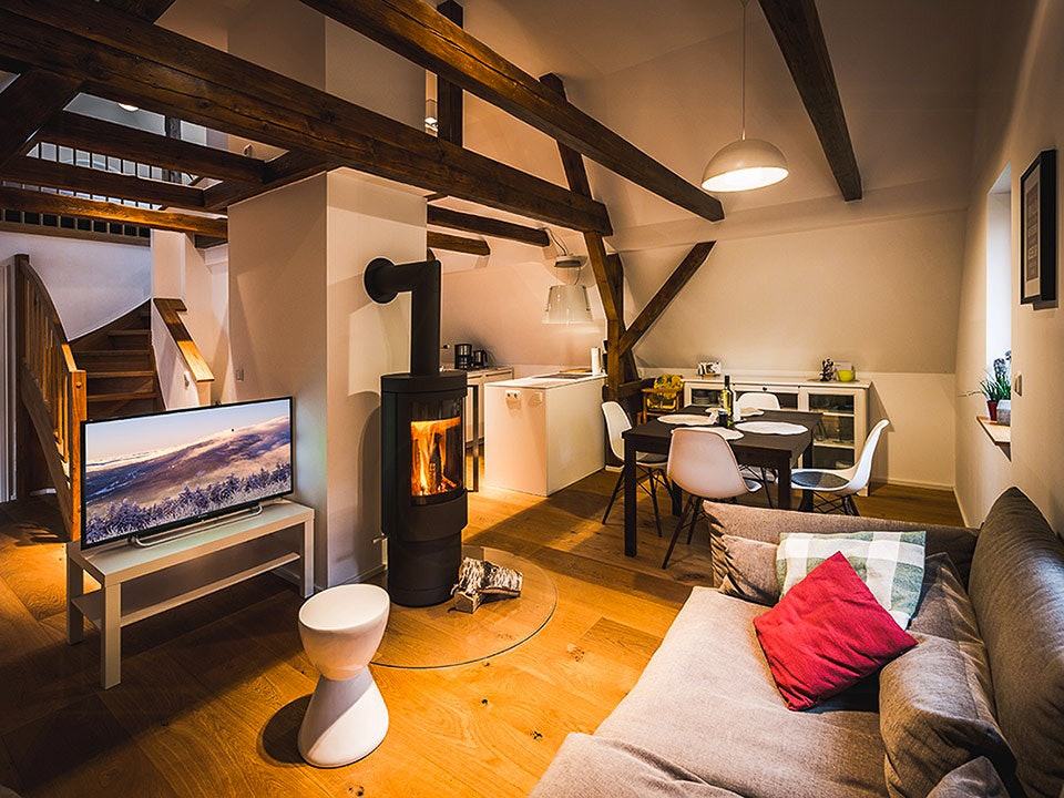 La casa offre diversi appartamenti, ognuno con la stessa ampia vista panoramica sul paesaggio. Un caminetto garantisce un calore confortevole nelle giornate più fresche e invita a concludere la serata in relax con un bicchiere di vino o una tazza di tè.