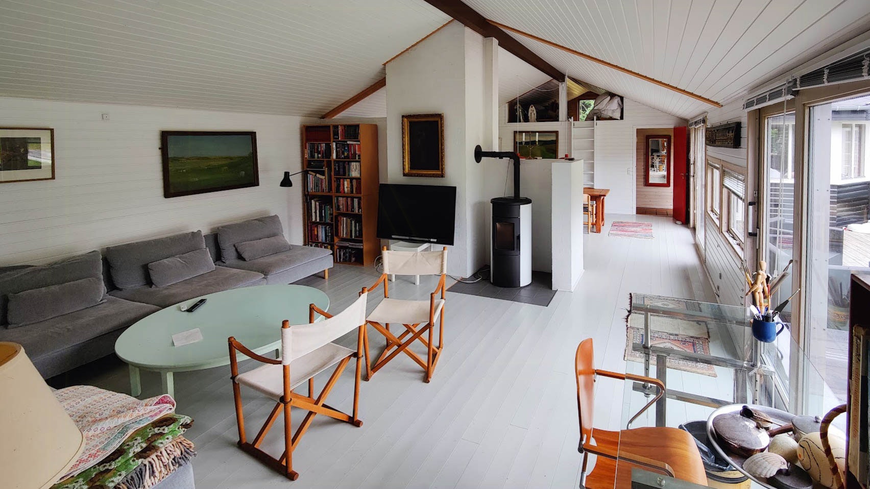 Nella parte più recente della casa, invece, c'è un soffitto a vista e molta luce attraverso le grandi finestre a tutta altezza. Sia nella sala da pranzo che in quella familiare, i grandi tavoli da pranzo offrono spazio in abbondanza per riunirsi e gustare pasti deliziosi e buone conversazioni. L'arredamento è un delizioso mix di mobili nuovi e retrò che si fondono bene insieme per creare un'atmosfera familiare. Accomodatevi sul grande divano ad angolo per una serata di cinema in comune, oppure salite la scala e trascorrete un momento di tranquillità nel soppalco.