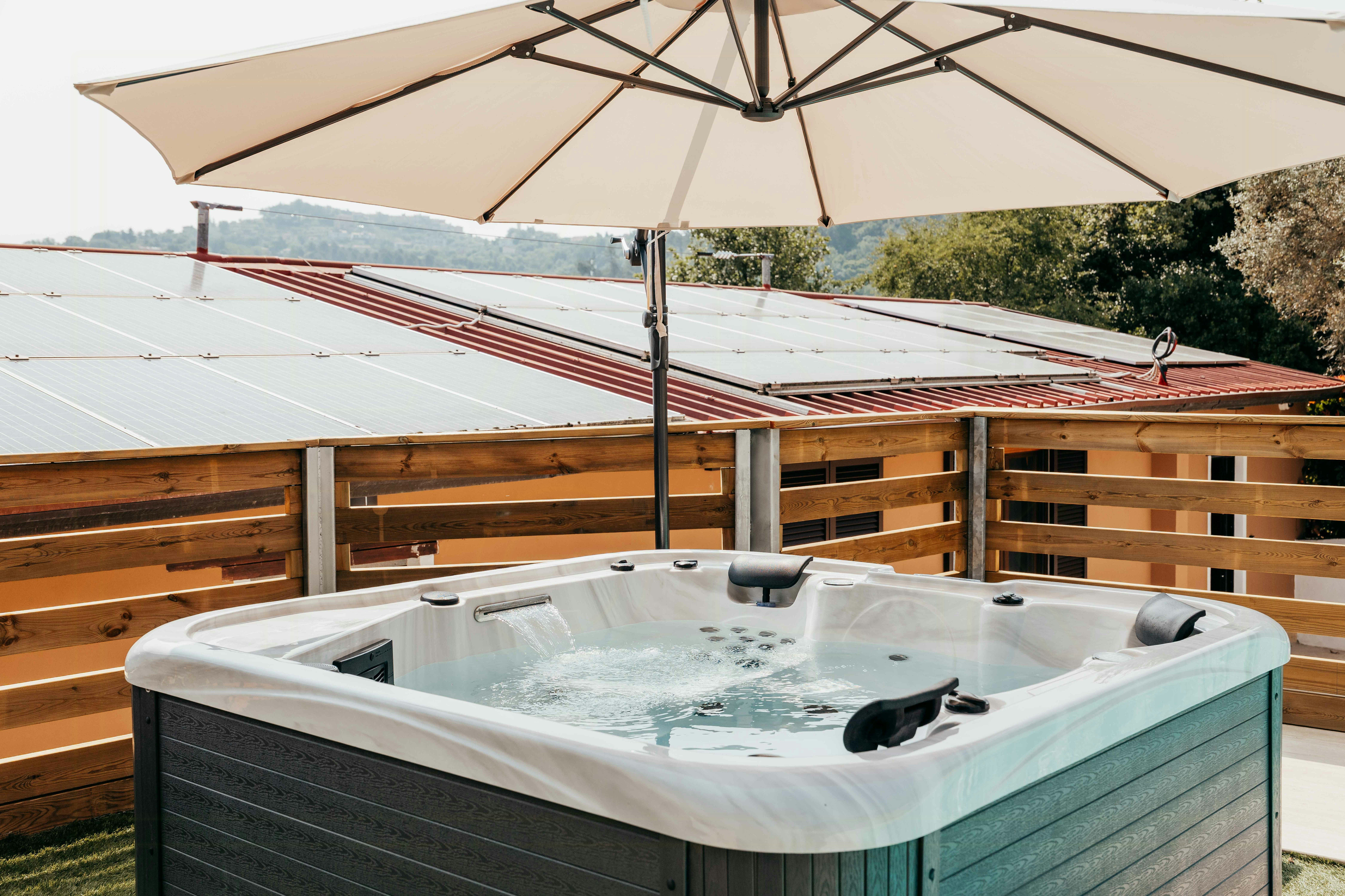 - Ontspan in het zwembad en de hot tub, omgeven door groen.