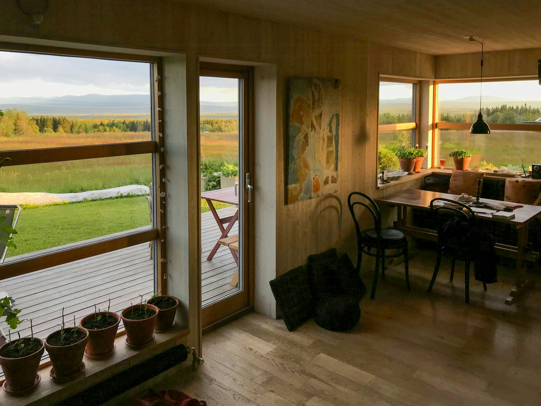 Utenfor drivhuset strekker den fantastiske utsikten seg mot Oviksfjällen og Åreskutan. Her kan du sitte lenge etter middagen, selv på kjøligere kvelder. Eiendommen har også et friskt utedo med kanskje verdens vakreste beliggenhet og kilometerlang utsikt. Ulike terrasser rundt huset gir deg sol fra morgen til kveld.