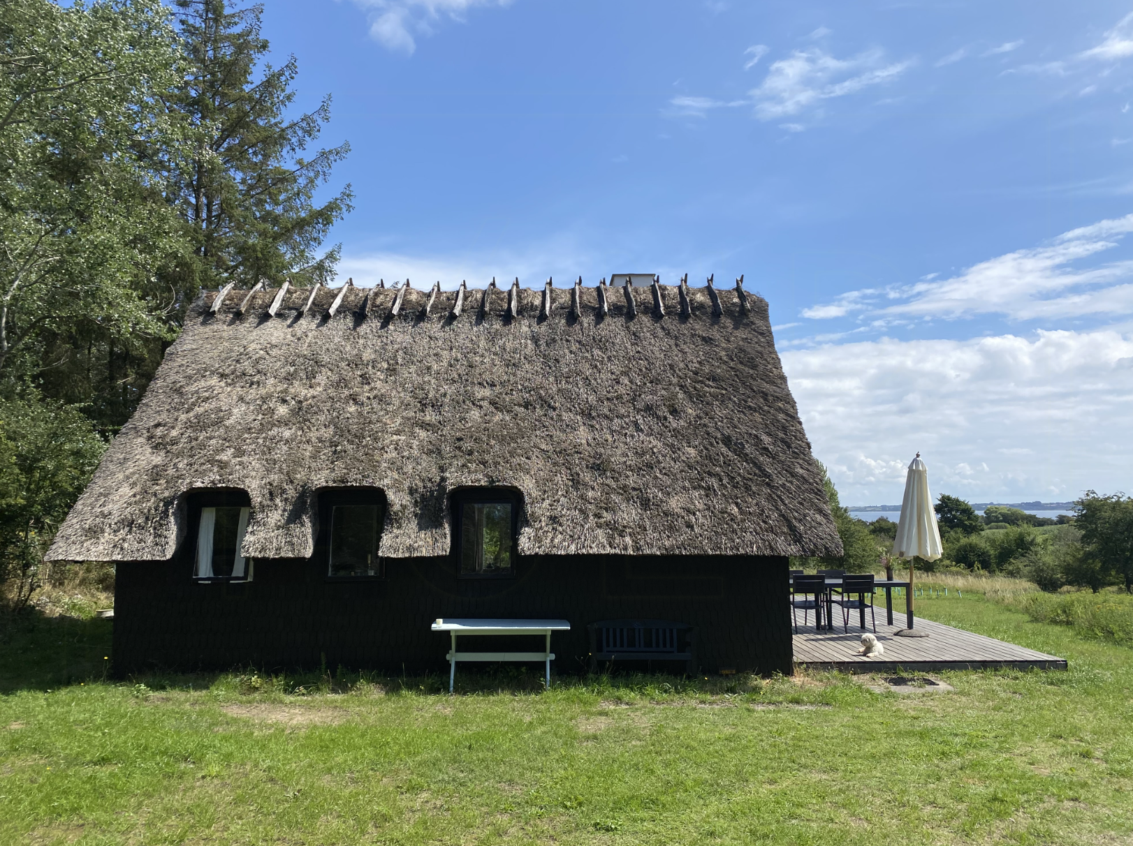 Halmhus med vinranker og privat skog