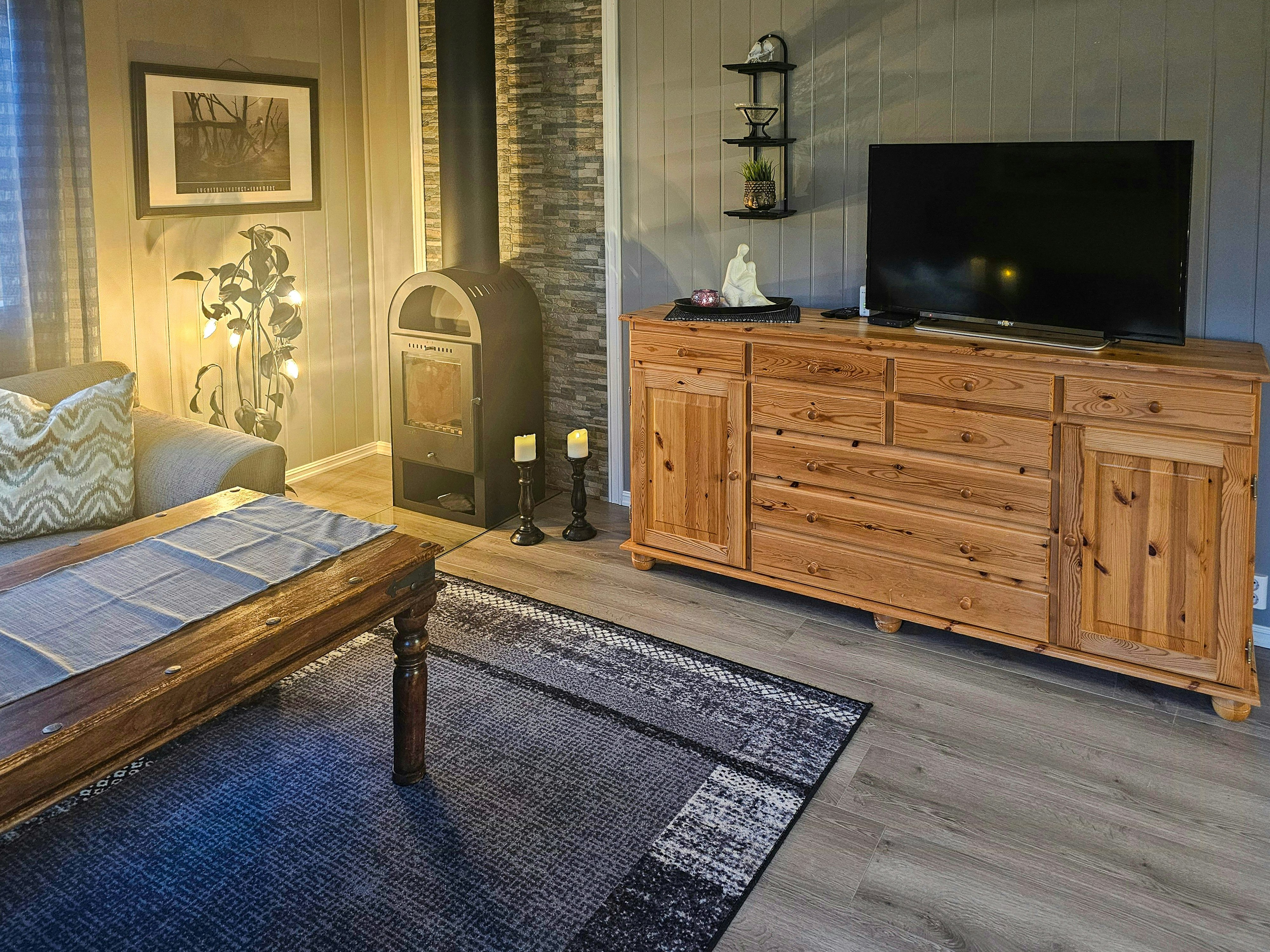 Lägenheten är inredd med ljusa, naturliga material som skapar en mysig atmosfär. Stora fönster släpper in dagsljuset och erbjuder utsikt över fjorden och bergen, medan bekväma möbler och små detaljer påminner om gårdens långa historia.