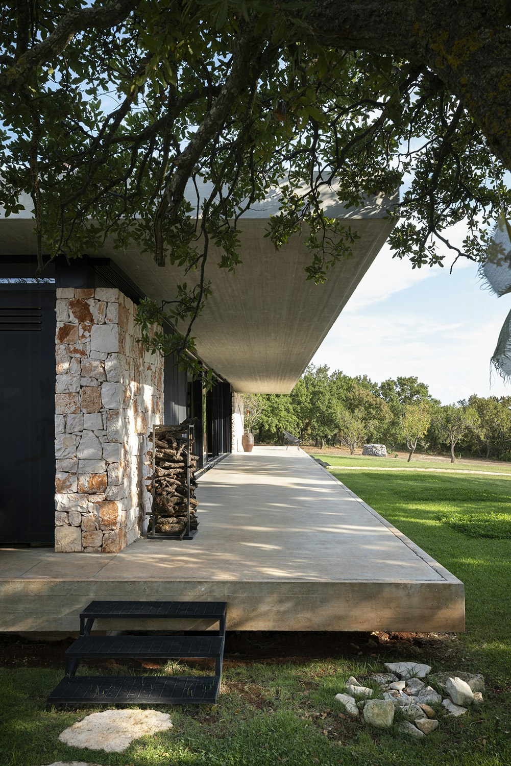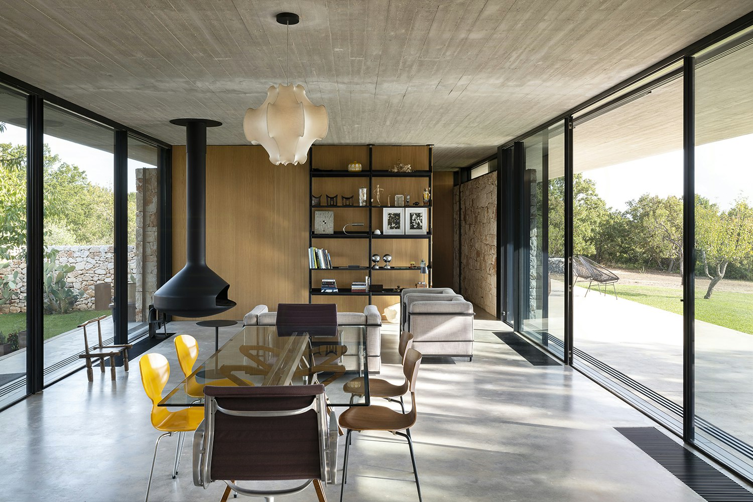 - Koppla av i ett öppet rum med en hängande öppen spis och skjutdörrar i glas som ramar in den apuliska landsbygden
